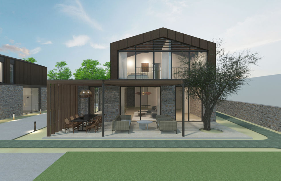 The aim of this settlement, designed for three families in Fethiye, was to bring a contemporary interpretation to traditional Aegean houses.
